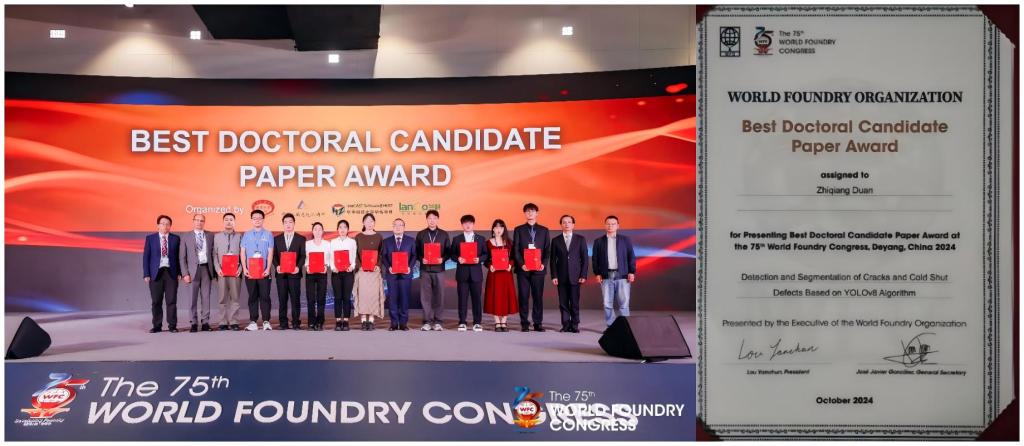 教育部共建铝镁材料研发应用协同创新中心赵宇宏教授团队10名师生应邀参会并做邀请报告。其中,博士生段志强的报告“Detection and segmentation of cracks and cold shut defects based on YOLOv8 algorithm”荣获第75届世界铸造大会最佳博士生论文奖。