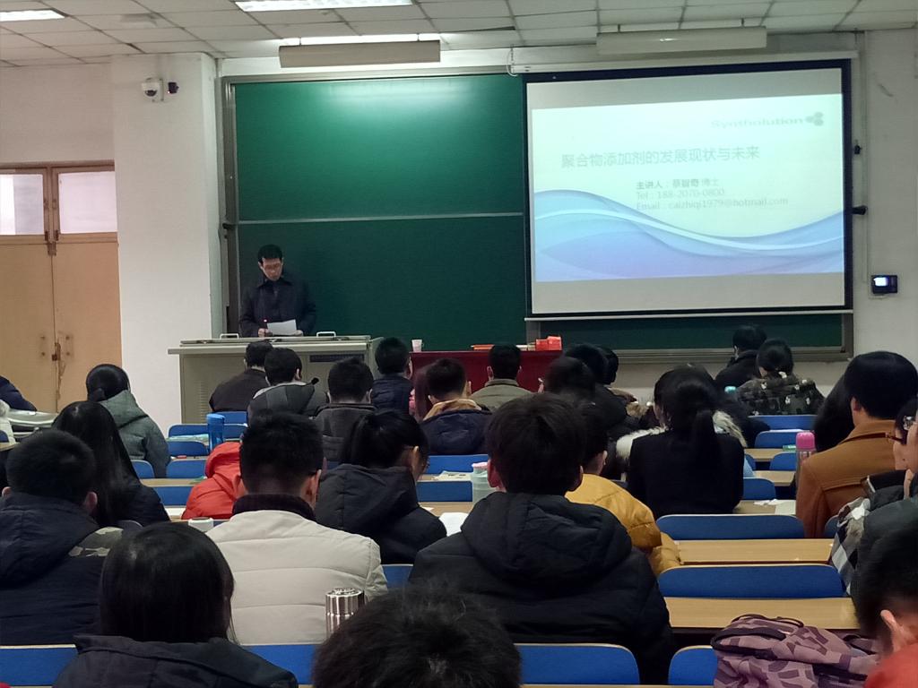 接下来,蔡智奇老师从石化园区和循环经济园区产业链规划优化和建设研究;环境友好功能精细化工产品的开发过程研究;涂料、油墨、胶粘剂及其他高分子精细化工产品等功能型纳米粒子/热固性树脂复合材料研究等方面阐述了聚合物聚合物添加剂的发展现状和未来,由于讲座的实用性强,会场上积极互动,师生受益匪浅。