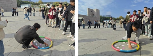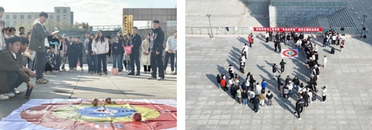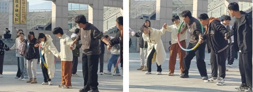 第二个项目“一圈到底”。这项游戏需要全队成员手拉手站成一排,用呼啦圈依次穿过所有人的身体,过程中手不能松开。队伍成员们争分夺秒地快速穿过呼啦圈,保证顺利穿过的同时,还要关心其他同学的情况,激情与温暖在此刻传递开来。