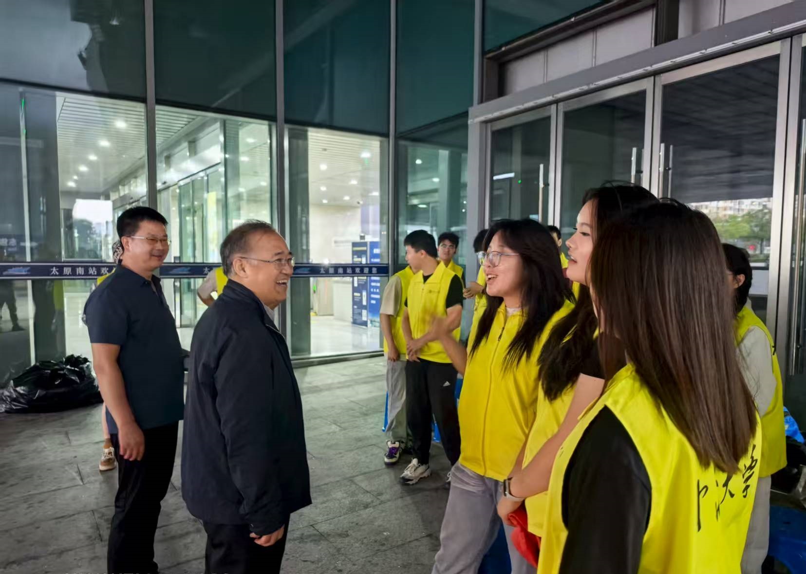 王强院长一行亲临太原南站接站服务点,亲切慰问奋战在一线的志愿者同学们,详细查看迎新接待流程,并对他们的辛勤付出表示感谢,同时叮嘱工作人员要始终以细心、耐心做好服务,展示出中北学子良好的精神面貌,让新生及家长第一时间感受到学校的温暖,确保每一位新生安全、顺利到校。