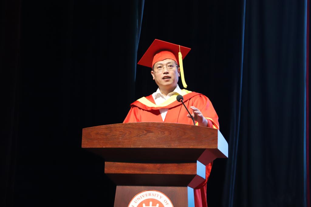 副校长潘晋孝教授满怀深情地向即将告别母校、踏上新的人生征途的毕业生表示最热烈的祝贺!他首先肯定了材料学子在这四年中获得的累累硕果,同时向毕业生们提出了殷切希望:成长的道路上,需要坚定不移地培养科学理性精神,带着好奇、开放、包容的心态和高度的自律去追求真理。其次,坚持梦想,始终保有出发的勇气,知行合一,勇担时代大任。最后,潘副校长深情寄语,母校永远是同学们的坚强后盾和心灵家园,祝愿全体毕业生前程似锦,生活美满!