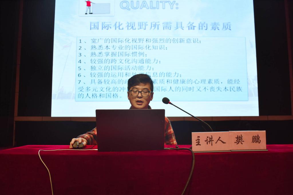 新生开阔国际化视野,提出国际化视野所应具备的七项素质,以及培养国际化视野的途径和走向国际化所必须具备的两个重要工具——通用语和学术英语。同时樊老师向同学们介绍了中北大学国际交流项目细则,为大一新生提出建议。