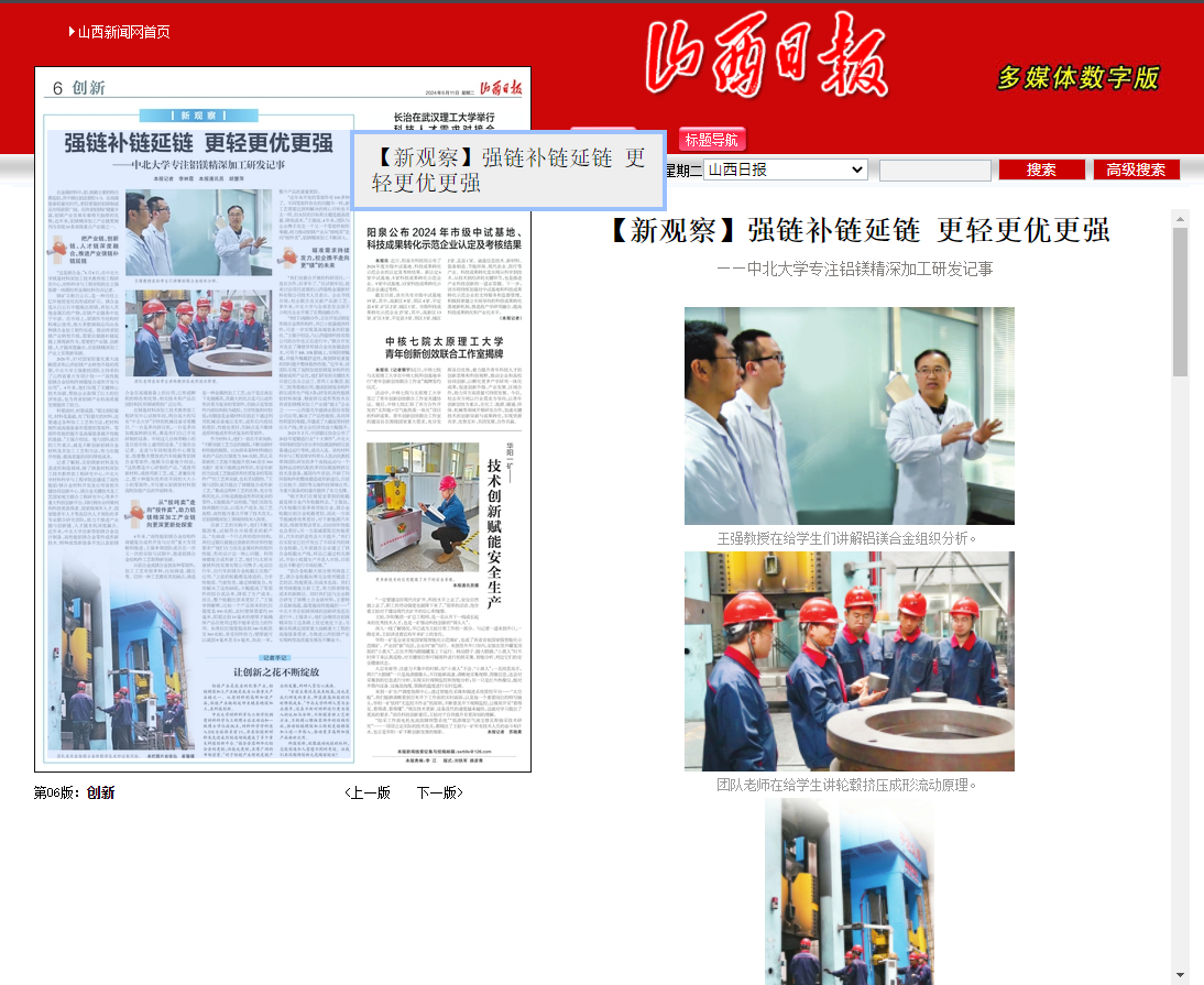 “我们与瑞格合作,正在开发试制变形镁合金筒形构件,并已小批量提供样件,可进一步实现某高端装备的轻量化。”王强介绍说,与山西盛镁科技有限公司的合作也正在进行中,“联合开发并攻克了薄壁异形镁合金壳体锻造技术,可用于AR、VR眼镜上,实现轻便佩戴,并提升佩戴舒适性,做到降低重量的同时提升整体散热性能。”近年来,该团队实现了高附加值铝镁复杂构件的精密成形产业化,他们研发的关键技术目前已在众立法兰、晋西工业集团、航天二院等落地应用,建成铝镁复杂构件挤压成形生产线3条;研发的高性能镁铝材料制备、精密挤压成形等技术在我省铝镁精深加工产业链“链主”企业之一——山西银光华盛镁业股份有限公司应用,解决了产品性能低、各向异性明显的难题,并建成了大截面型材挤压生产线,使企业经济效益大幅提升。