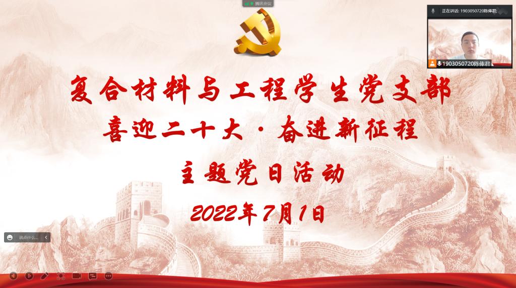 2022年7月1日,复合材料与工程学生党支部在腾讯会议上召开了“喜迎二十大·奋进新征程”主题党日活动。本次活动由党支部副书记陈俸君同志主持,参会的同志有院党委委员杜瑞奎同志以及党支部全体党员同志。