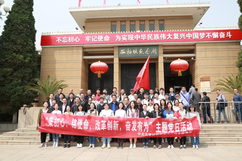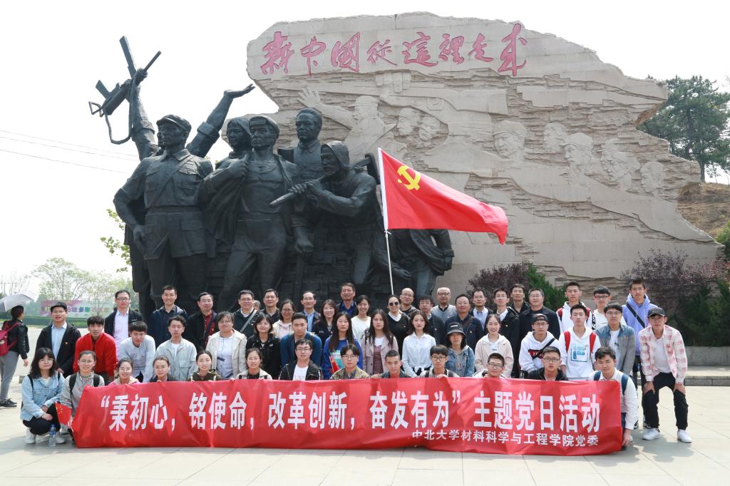 为加强基层党建工作,落实“改革创新,奋发有为”大讨论活动,增强基层党支部的战斗堡垒作用,2019年4月21日,材料学院党委举行“秉初心,铭使命,改革创新,奋发有为”主题党日活动,组织全院党委委员、各支部支委及优秀党员代表52名赴革命圣地西柏坡进行实践学习。在去往西柏坡的路上,院党委副书记郭云霞老师首先组织大家进行了西柏坡历史和西柏坡精神的学习,开展了西柏坡知识有奖问答,还穿插了各支部红歌比赛,近4小时的车程在抢答和欢歌笑语中愉快渡过。